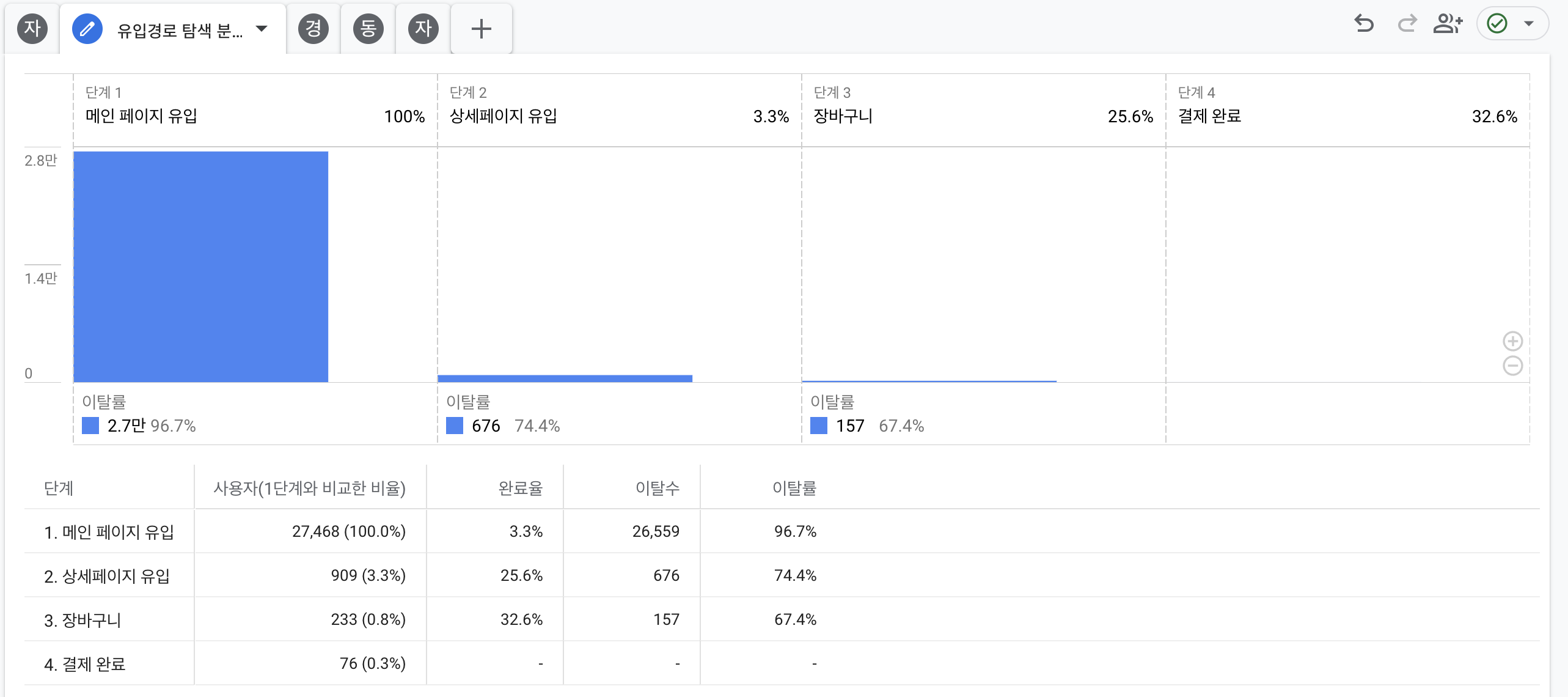 실제로 내가 직접 설계한 퍼널의 결과를 살펴보면 메인페이지 유입한 유저들을 기준으로 결제완료까지 도달하는 비율은 0.3%임을 확인할 수 있다. 강사님이 보여주신 예시에서는 1.3% 정도 비율이였는데 어디에서 유실이 났는지는 잘 모르겠지만, 이번 블로그 포스팅의 핵심은 기본적인 퍼널설계를 어떻게 하는지를 기록하기 위함이기 때문에 넘어가도록 하자.