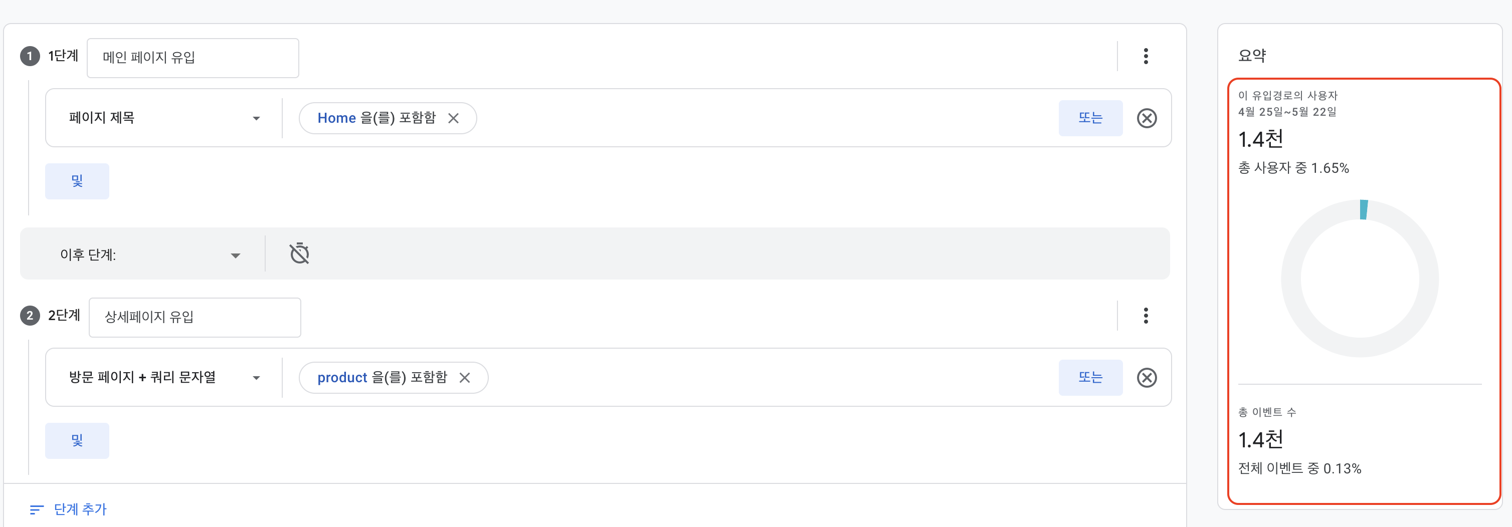 상세페이지에 접속하는 이벤트들을 추적하기 위해서는 새 조건 추가 > 페이지/화면 > 방문 페이지 + 쿼리 문자열 > 필터: product 를 통해 추가할 수 있으며 그 결과 아래와 같이 4.6만 -> 1.4천 으로 이벤트 개수가 확연하게 줄은 것을 확인할 수 있다. 여기서 서비스 기획이