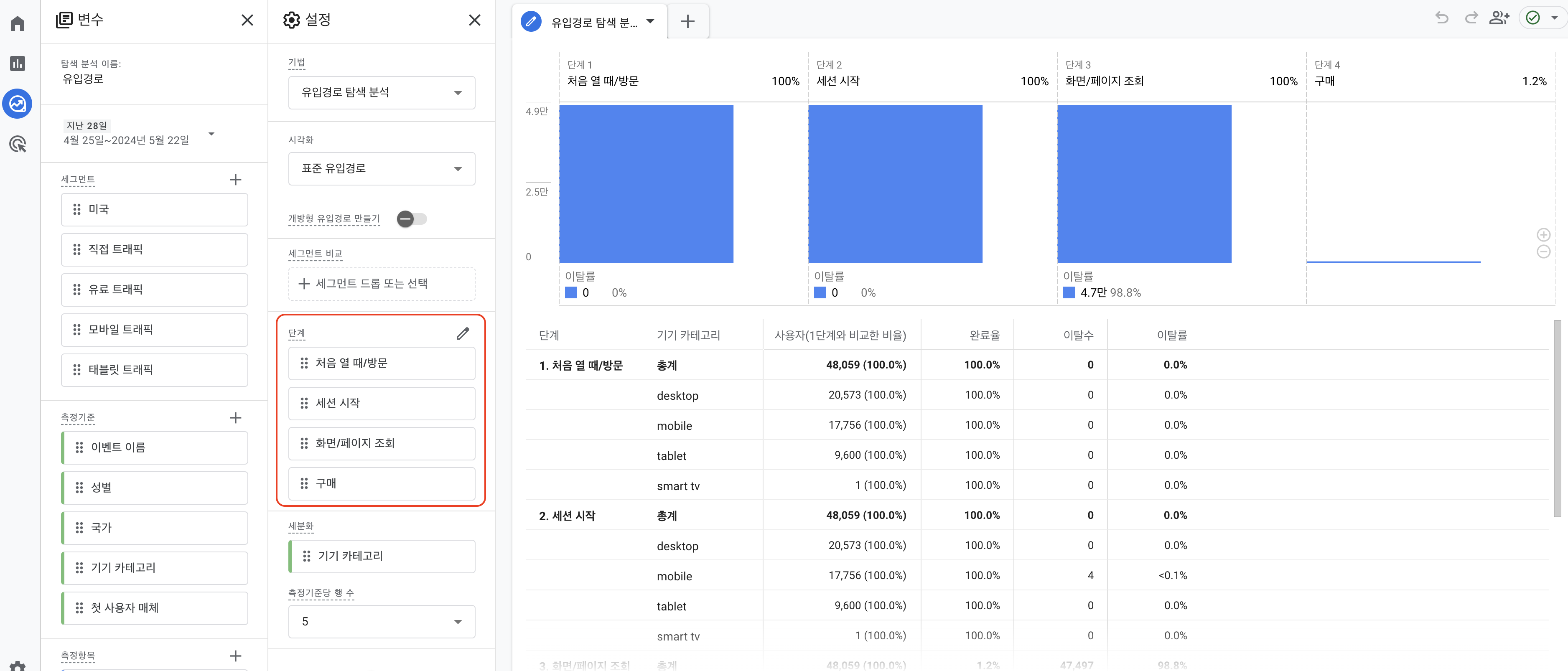 템플릿을 열게되면 아래와 같은 화면이 열리게 되는데 항목이 너무 많아서 처음보는 사람들은 당황할 수 있다. 당황하지말고 아래와 같이 단계 > 편집 을 클릭하면 기본적인 Funnel 분석을 위한 준비는 끝마치게 된다.