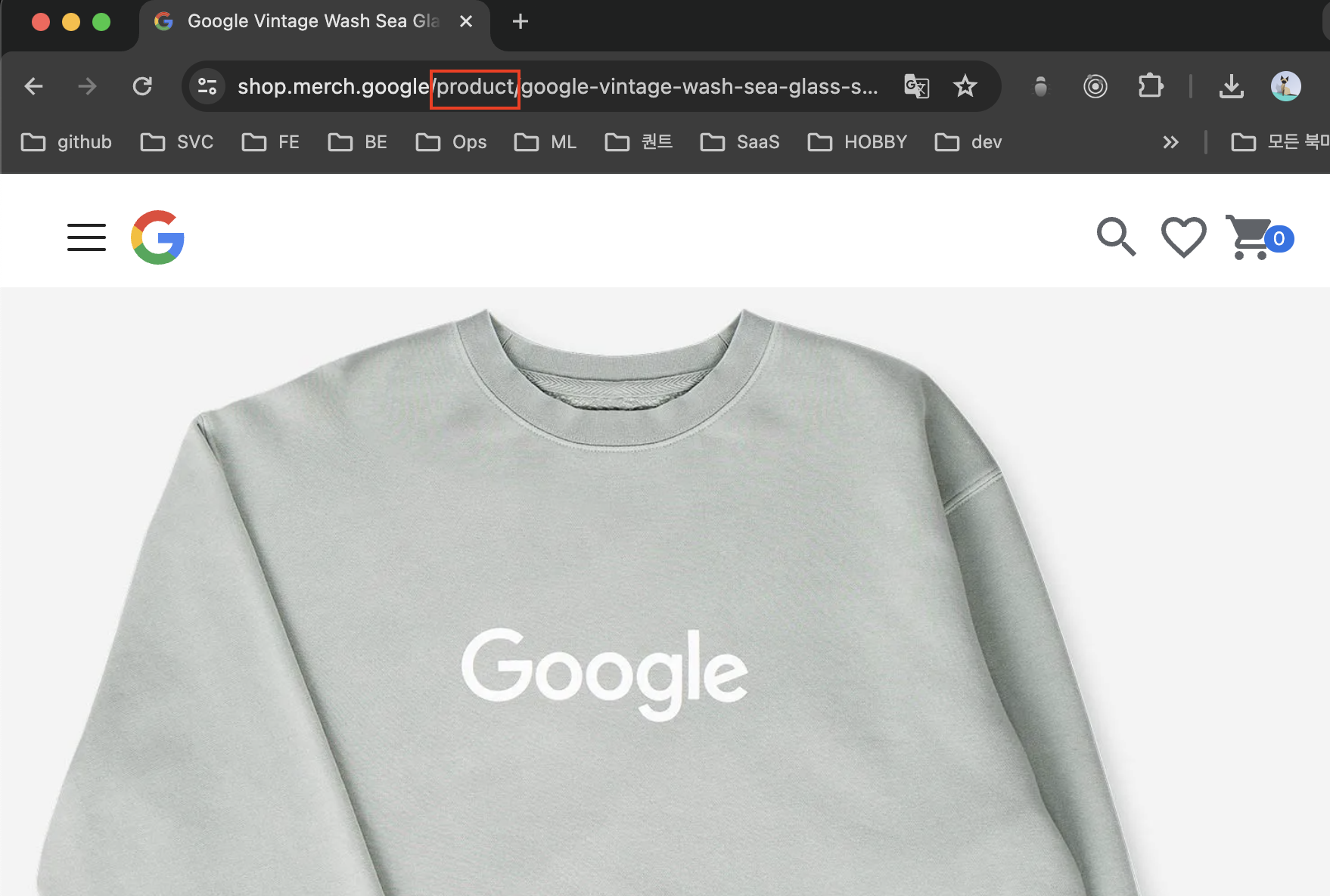 다음으로 생각해볼 수 있는 유저의 행동은 관심있는 품목을 확인하는 상세페이지 접속이다. 1단계와 비슷하게 새로운 단계를 추가하면되는데 실제 홈페이지에서 상세페이지에 접속하면 URL에 product 라는 문자열을 기반으로 상세페이지들을 소개하고 있다.