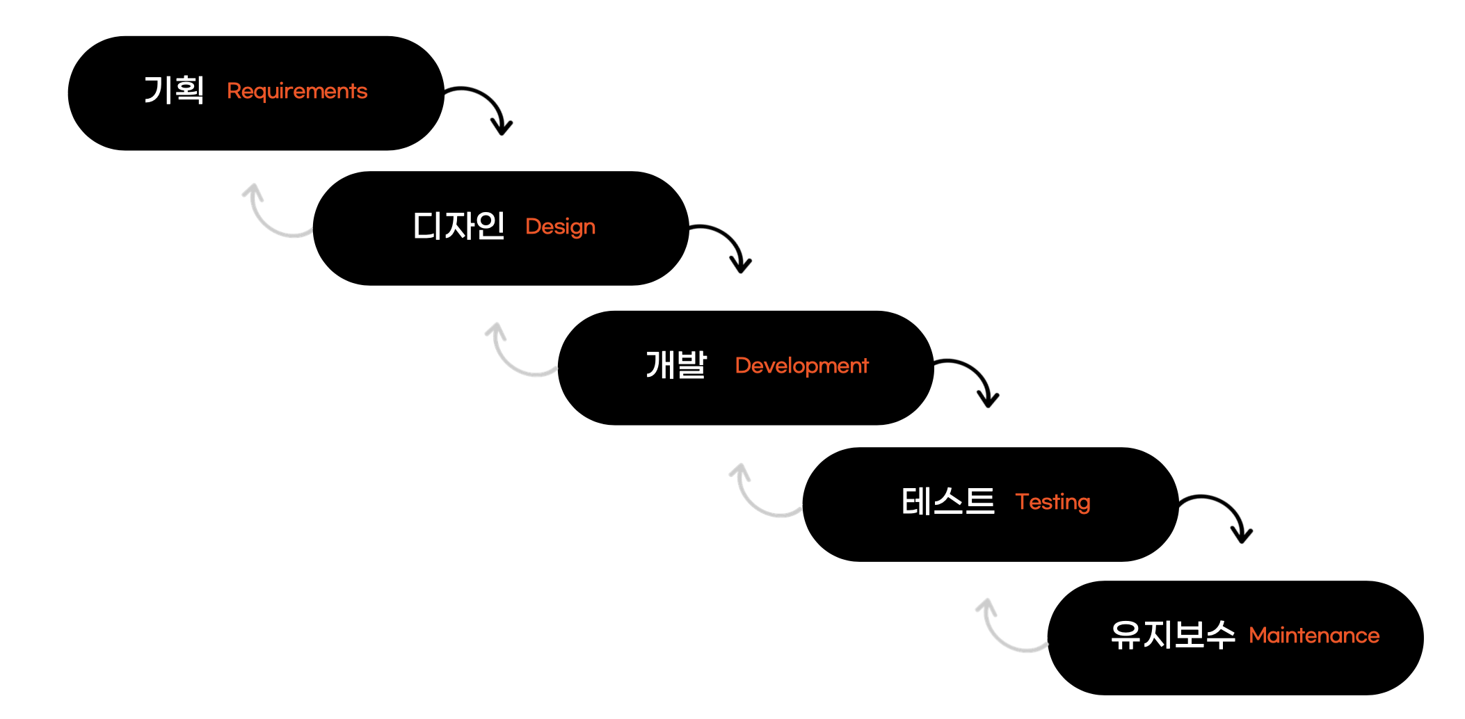 워터폴은 위에서 아래로 떨어지는 수직적인 방식으로 절차지향적인 방법론이다. 하나의 스텝이 끝나면 그 다음 방식으로 넘어가는 형식으로