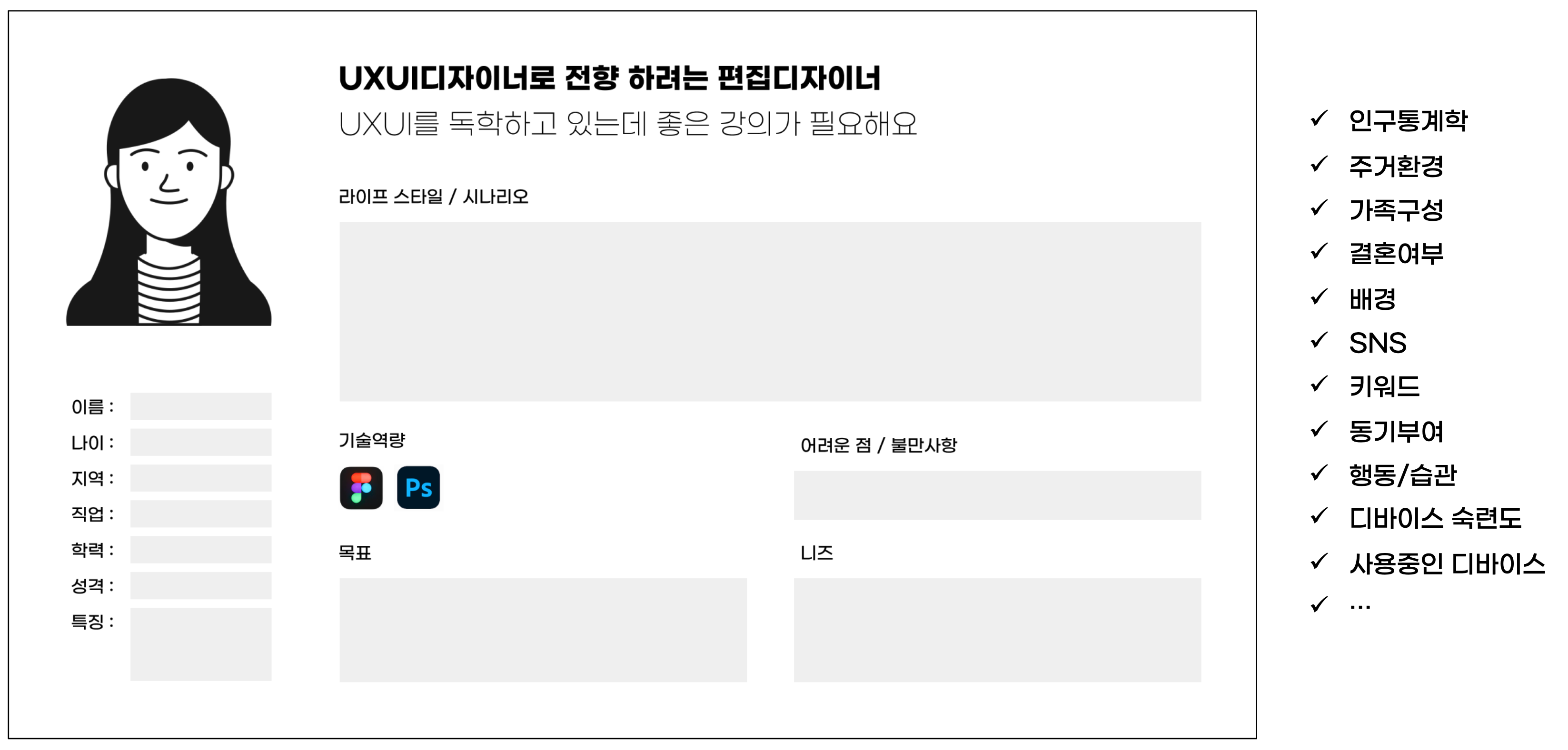 인터뷰, 설문 등 사용자 연구를 통해 얻어진 데이터를 기반으로 대상 사용자 층을 대표하는 가상의 인물 ▶︎ 사용자 니즈에 맞는 최적화된 사용자 경험 구축