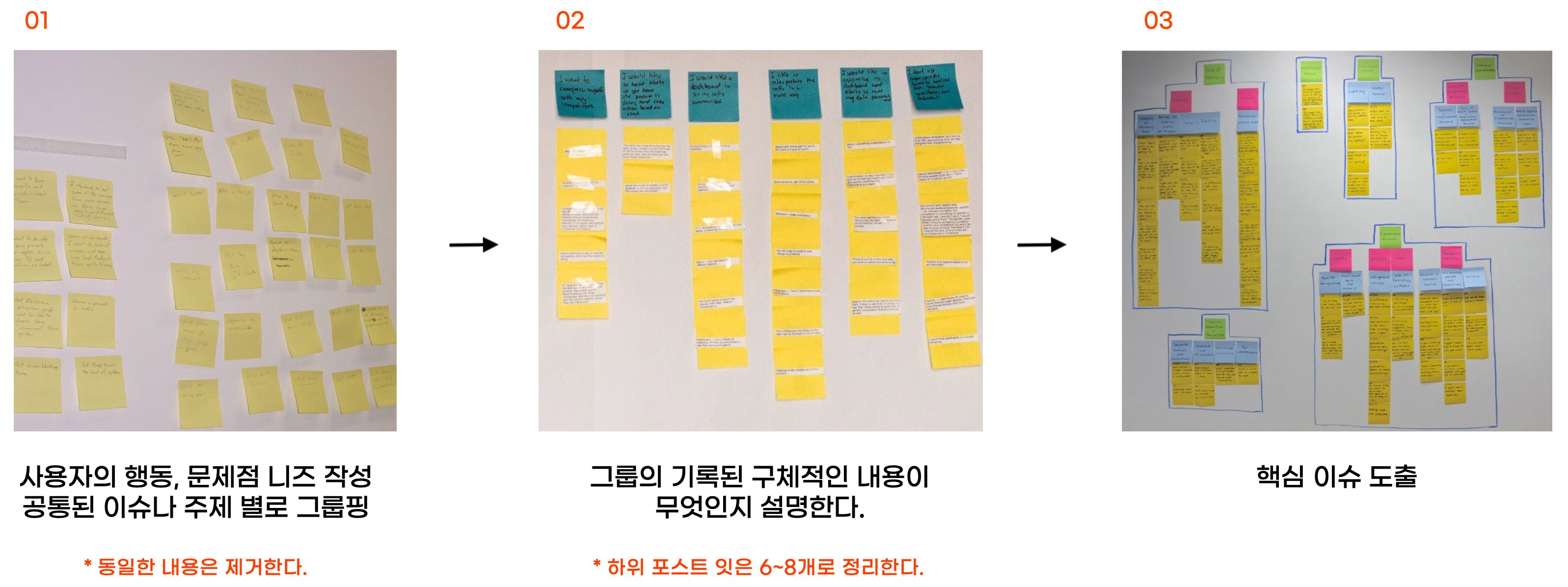 방대한 데이터 사이에서 의미 있는 규칙을 발견하는 그룹핑 기법. 리서치를 통해 수집된 데이터를 분류하고 정리하는데 사용됨 ▶︎ 공통의 이슈, 주제, 고객의 문제와 니즈를 한눈에 파악 할 수 있다.