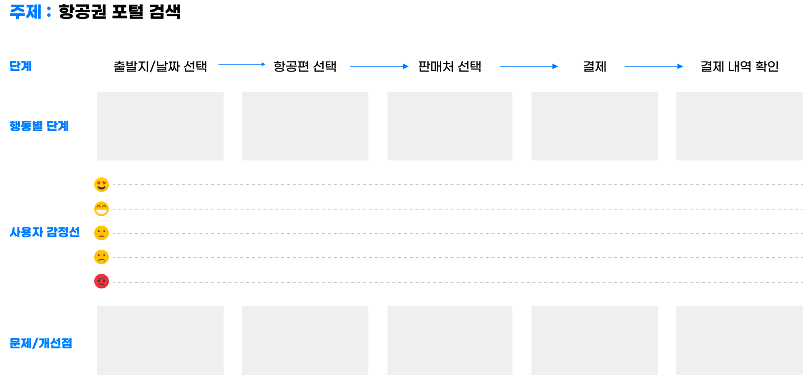 사용자가 목적을 달성하기 위해 행하는 과정을 시각화 한 것. 기능별 행동에 대한 만족도로 문제점 도출